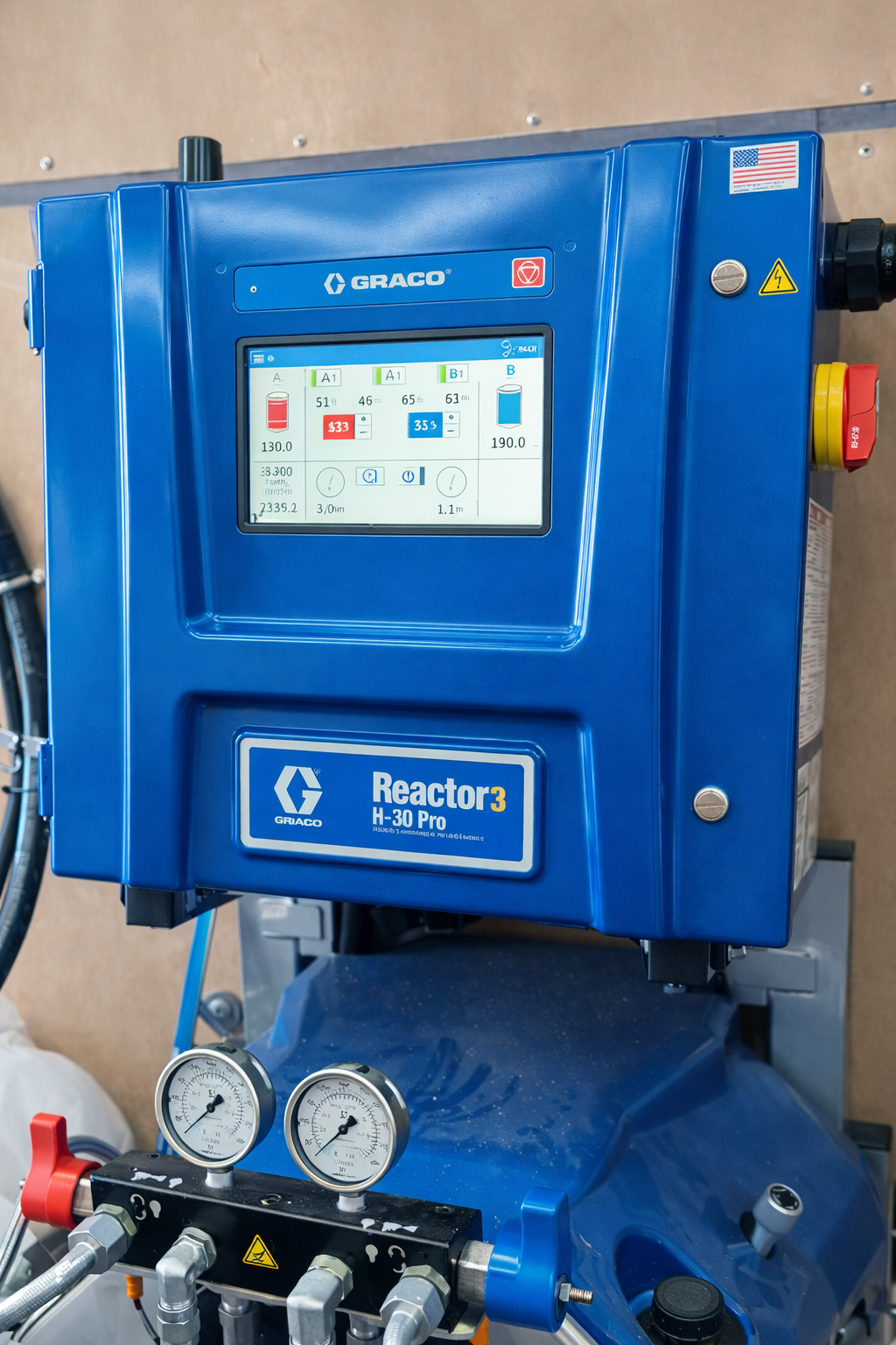 To urządzenie to Graco Reactor 3 H-30 Pro — profesjonalny, hydrauliczny dozownik/proporcjoner do piany natryskowej, stosowany głównie przy aplikacji systemów PUR/PIR oraz w szerszej rodzinie Reactor także do prac z polimocznikiem; jego zadaniem jest precyzyjne pobieranie dwóch składników materiału, czyli komponentu A i B, utrzymywanie ich we właściwej proporcji, podgrzewanie ich do zadanej temperatury oraz podawanie pod odpowiednim ciśnieniem do węża i pistoletu natryskowego, tak aby wykonawca uzyskał równą strukturę piany, stabilny natrysk i powtarzalną jakość izolacji.